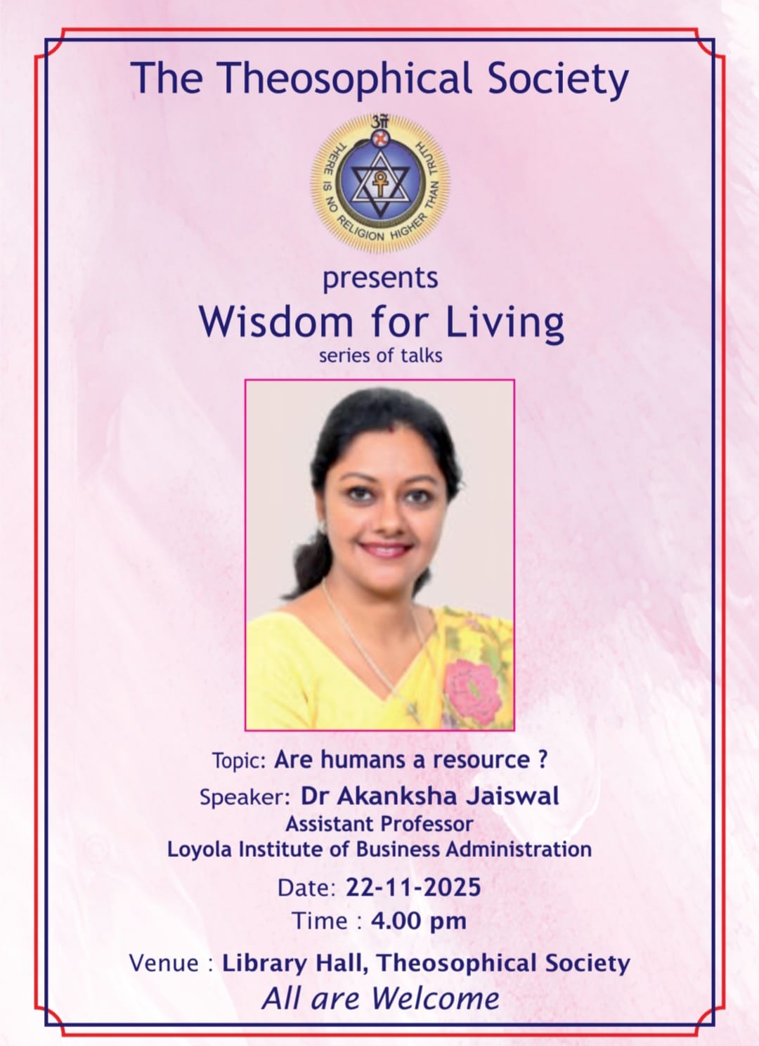 Our next talk on the Wisdom For Living Series of Monthly Programs is going to be a talk by Dr Akanksha Jaiswal, Assistant Professor at Loyola Institute of Business Management, Chennai.
