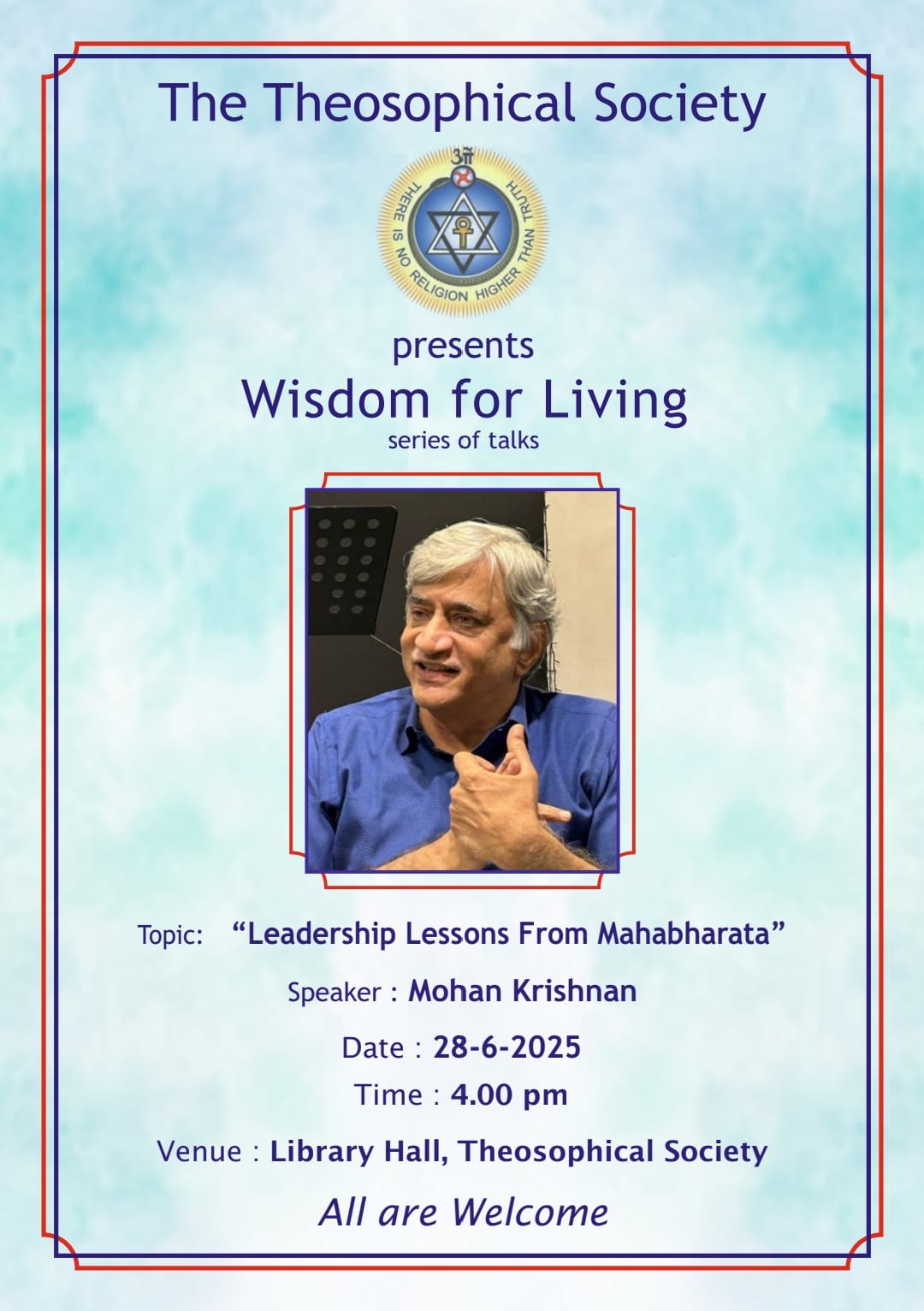 Mr Mohan Krishnan will be giving a talk on "About the Leadership Lessons From Mahabharata."