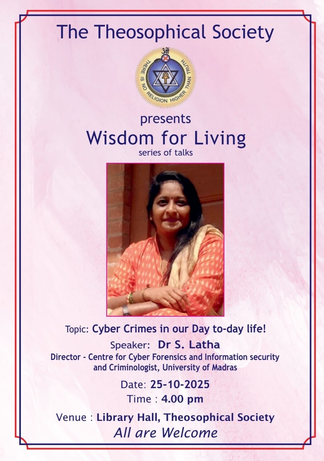 Subject Cyber Crime in our Day-to-day Life At Adyar Campus Wisdom for Living WFL Talk Oct 2025 Venue Adyar Library and Research Centre Time (IST) 25/10/2025 - 16:00 - 25/10/2025 - 17:30 Event Speaker Dr S. Latha Sign Up Link Private Public Content All are Welcome! What is provided